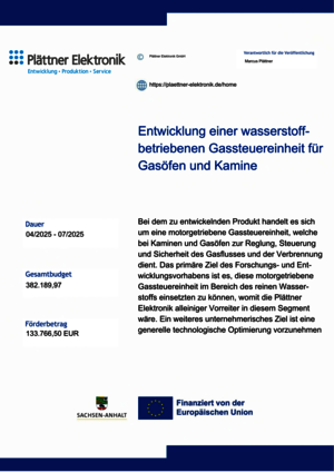 Bei dem zu entwickelnden Produkt handelt es sich um eine motorgetriebene Gassteuereinheit, welche bei Kaminen und Gasöfen zur Reglung, Steuerung und Sicherheit des Gasflusses und der Verbrennung dient. Das primäre Ziel des Forschungs- und Entwicklungsvorhabens ist es, diese motorgetriebene Gassteuereinheit im Bereich des reinen Wasserstoffs einsetzten zu können, womit die Plättner Elektronik alleiniger Vorreiter in diesem Segment wäre. Ein weiteres unternehmerisches Ziel ist eine generelle technologische Optimierung vorzunehmen.